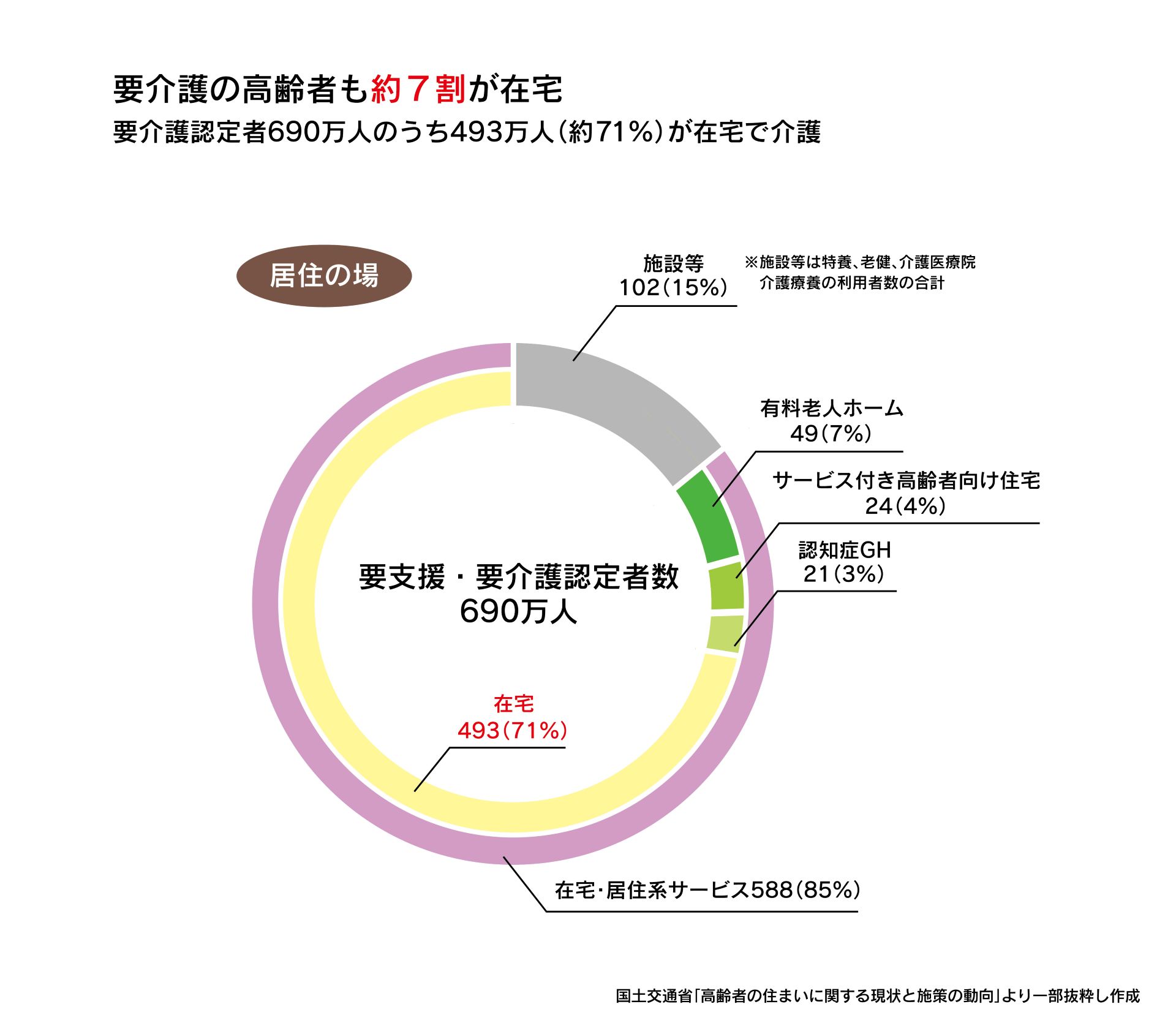 国土交通省の資料によると、要介護認定を受けた約690万人のうち、約71%の約493万人が在宅で介護を受けていることが分かります。高齢者住宅や介護施設で暮らしている人はごく一部にすぎません。高齢になれば施設に入るのが一般的だと考えるのは、実態とは大きくかけ離れているといえるでしょう。