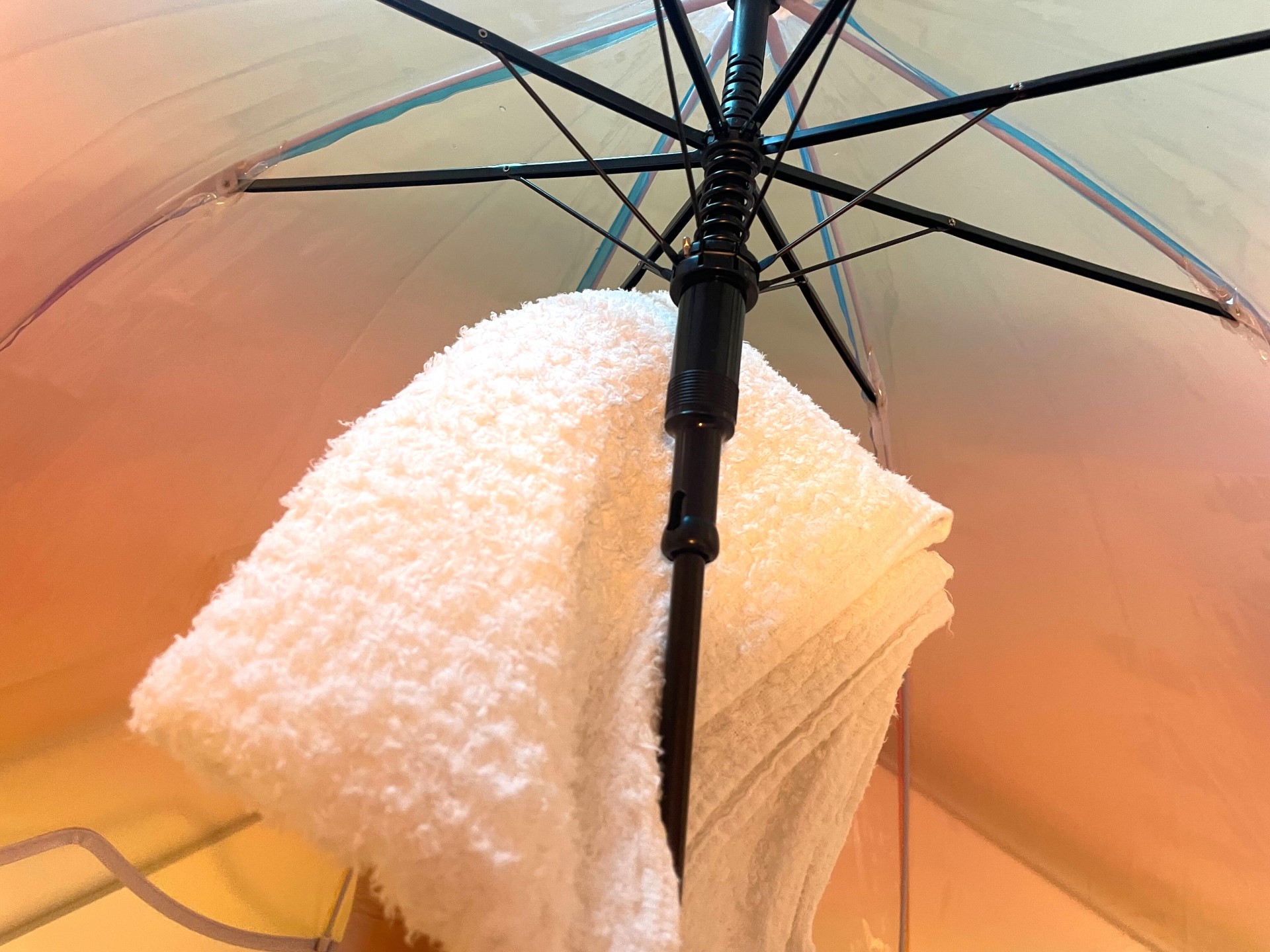 石突やシャフト、ランナーに付着した水滴をタオルで拭き取り、傘を開いた状態で持ち手を下にして、水気が完全になくなるまで干します。